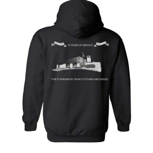 black hooded sweatshirt- Banneker fire station 55th anniversary shirt