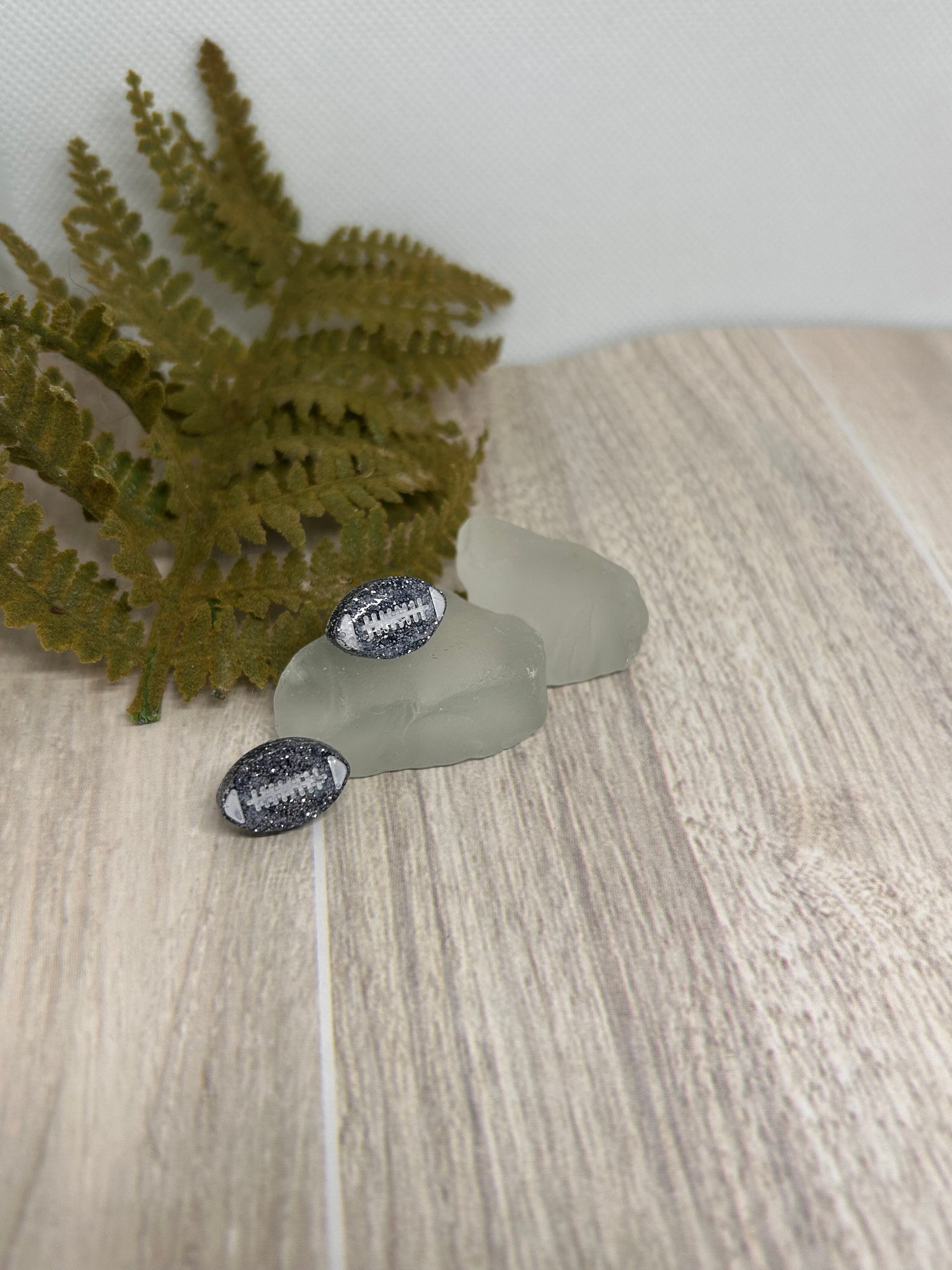 Hypoallergenic nickel free stainless steel stud football earrings with gun metal glitter and hand painted detail to support your favorite local football team