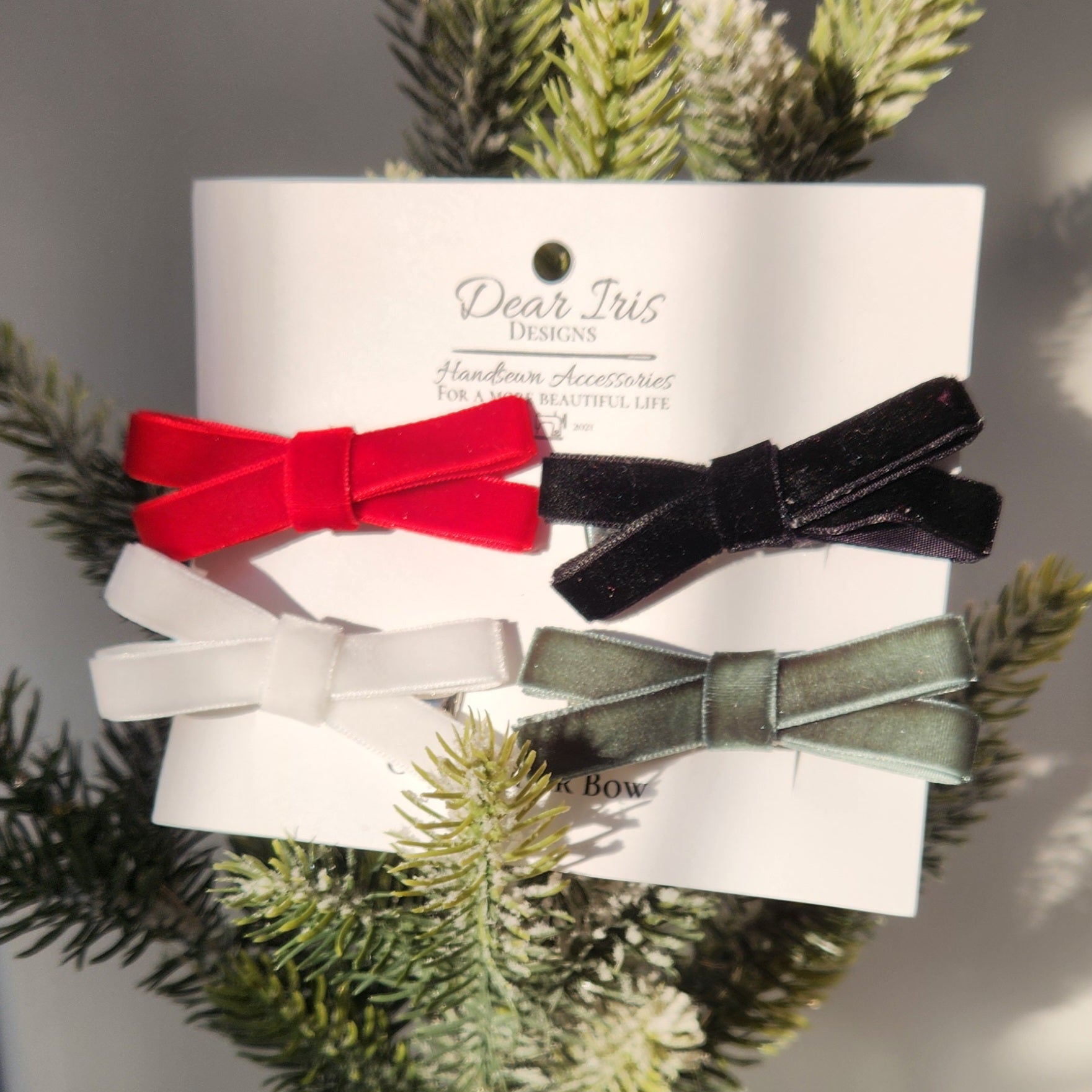 Four pack of velvet bow hair clips. Red, Green, Black & White.