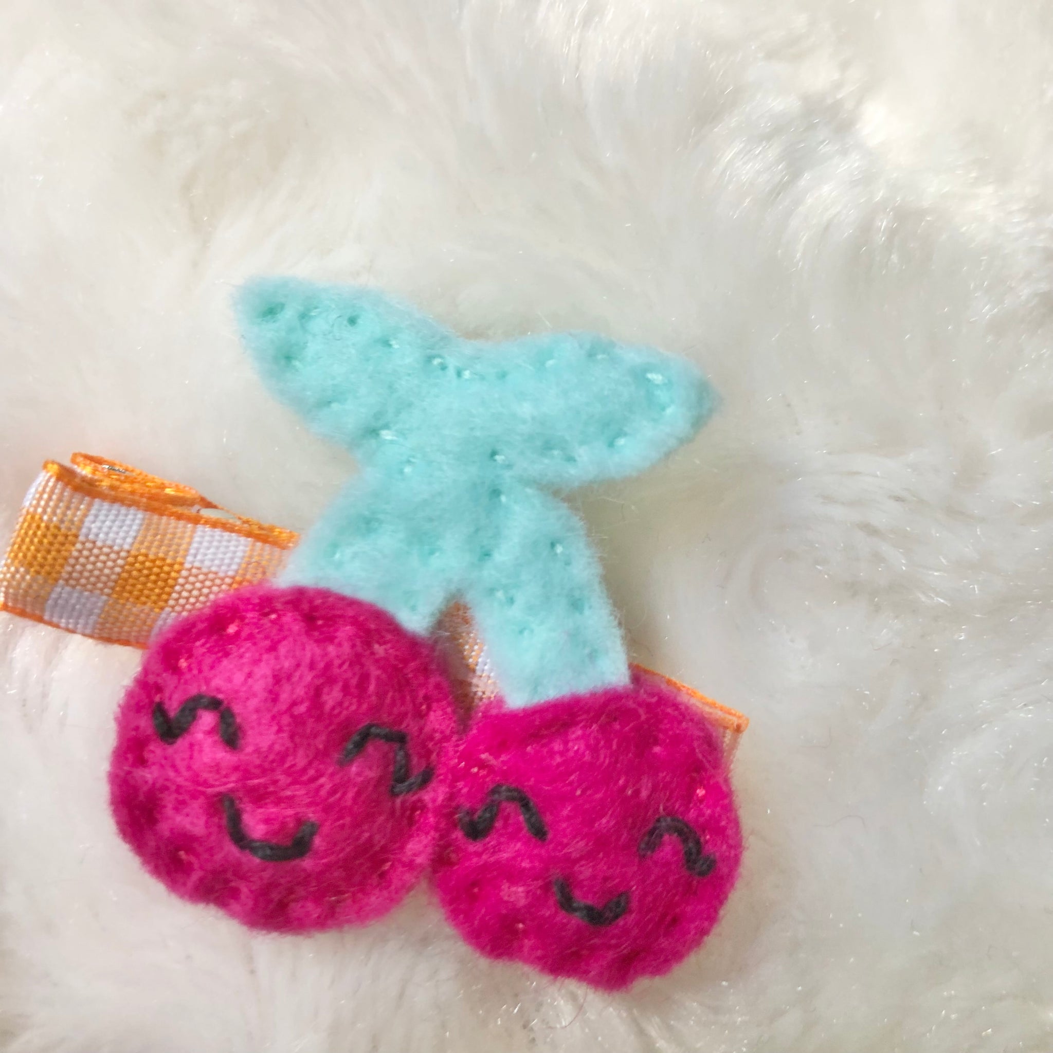 Happy fruit clips for your hair! Hand embroidery cherry on top of a coordinating ribbon lined hair clip. Clips are 2 inches long.