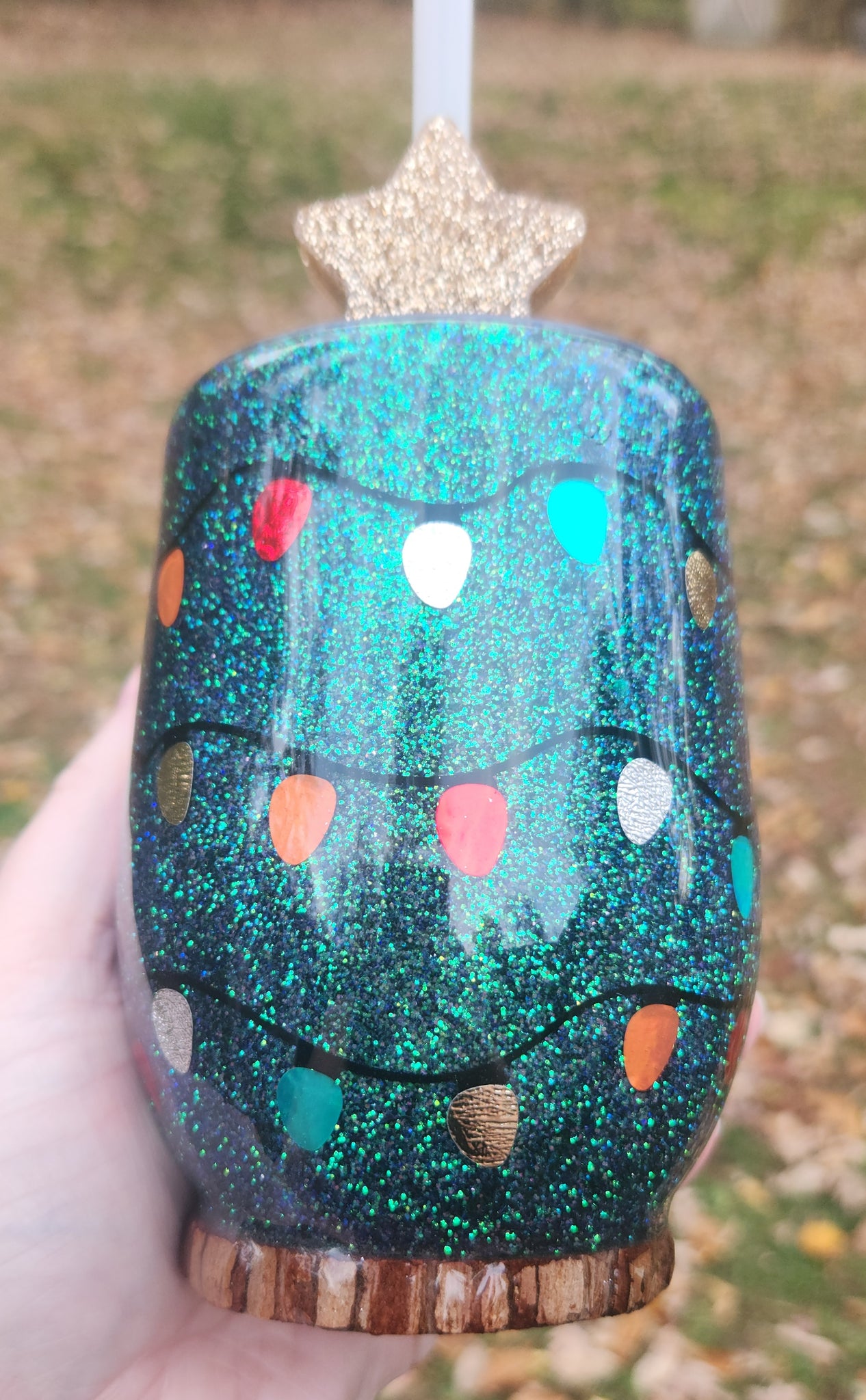 This stainless steel wine tumbler was hand-decorated using layers of paint, glitter, vinyl decals, diamond dust, and premium epoxy resin. Has a real wood slice on the bottom to look like a tree trunk. Comes with a handmade star straw topper.
