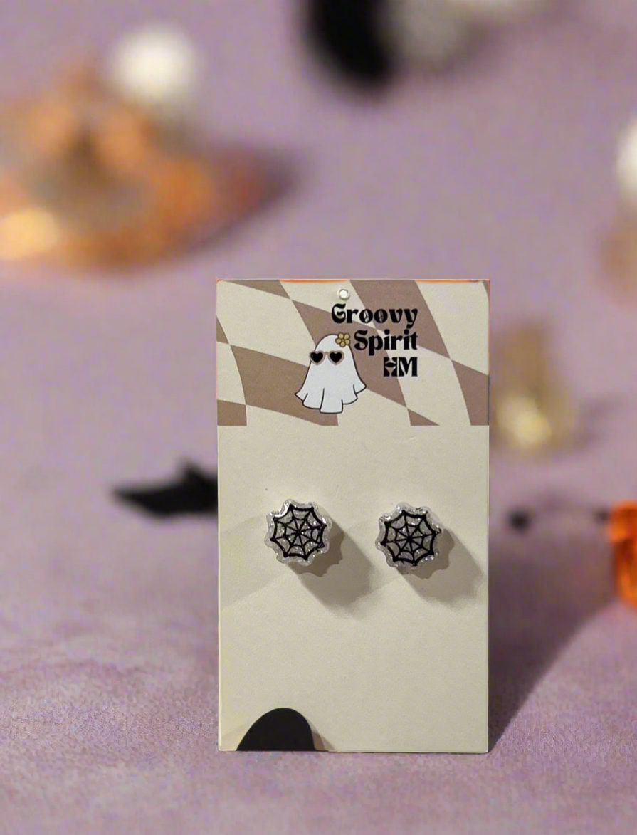 Lightweight resin stud earrings in the shape of a iridescent white glitter spiderweb with hand painted details on nickel free hypoallergenic steel posts