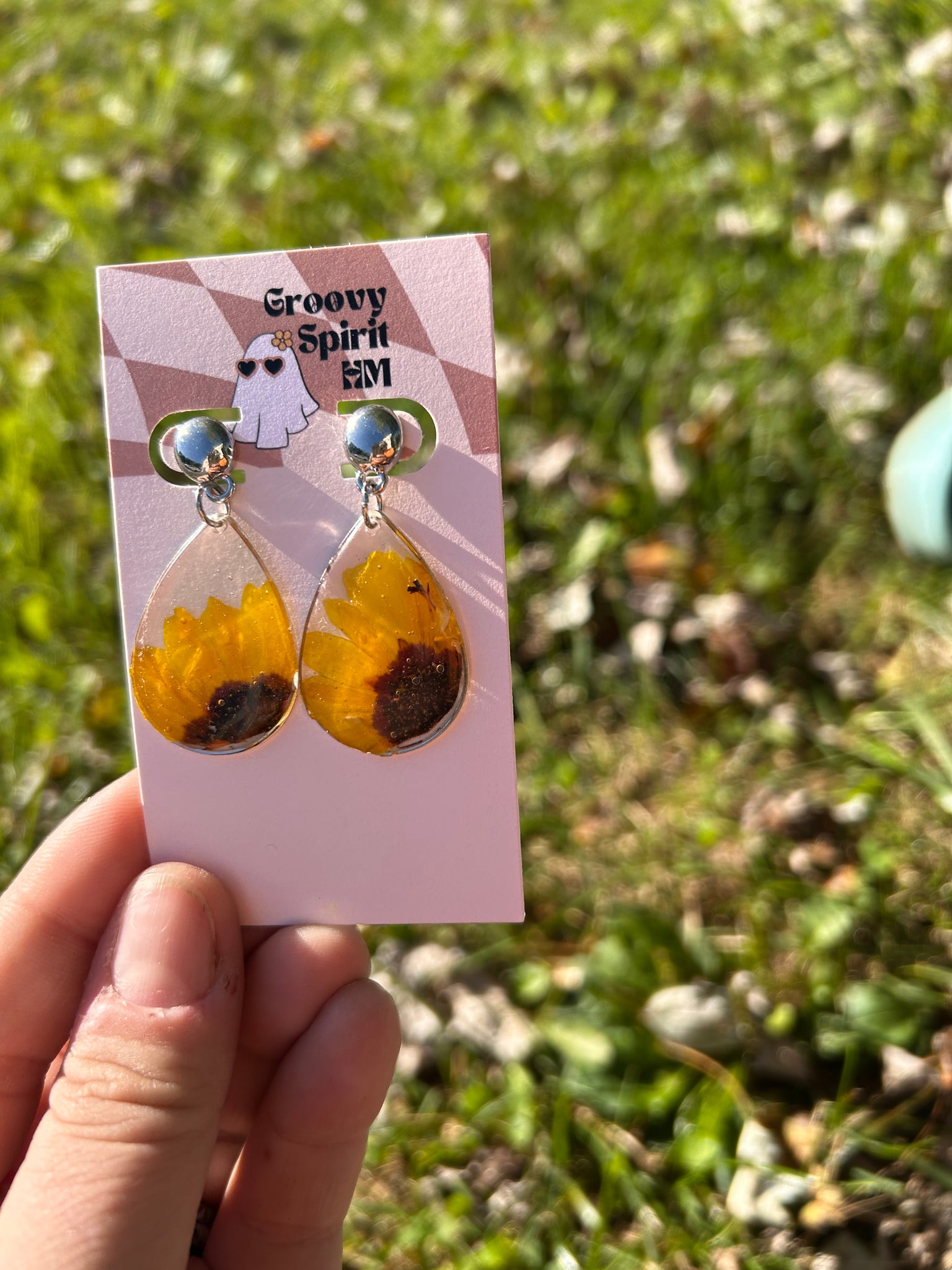 pressed black eyed Susan’s preserved in crystal clear resin with a gorgeous tear drop frame on hypoallergenic stud earrings