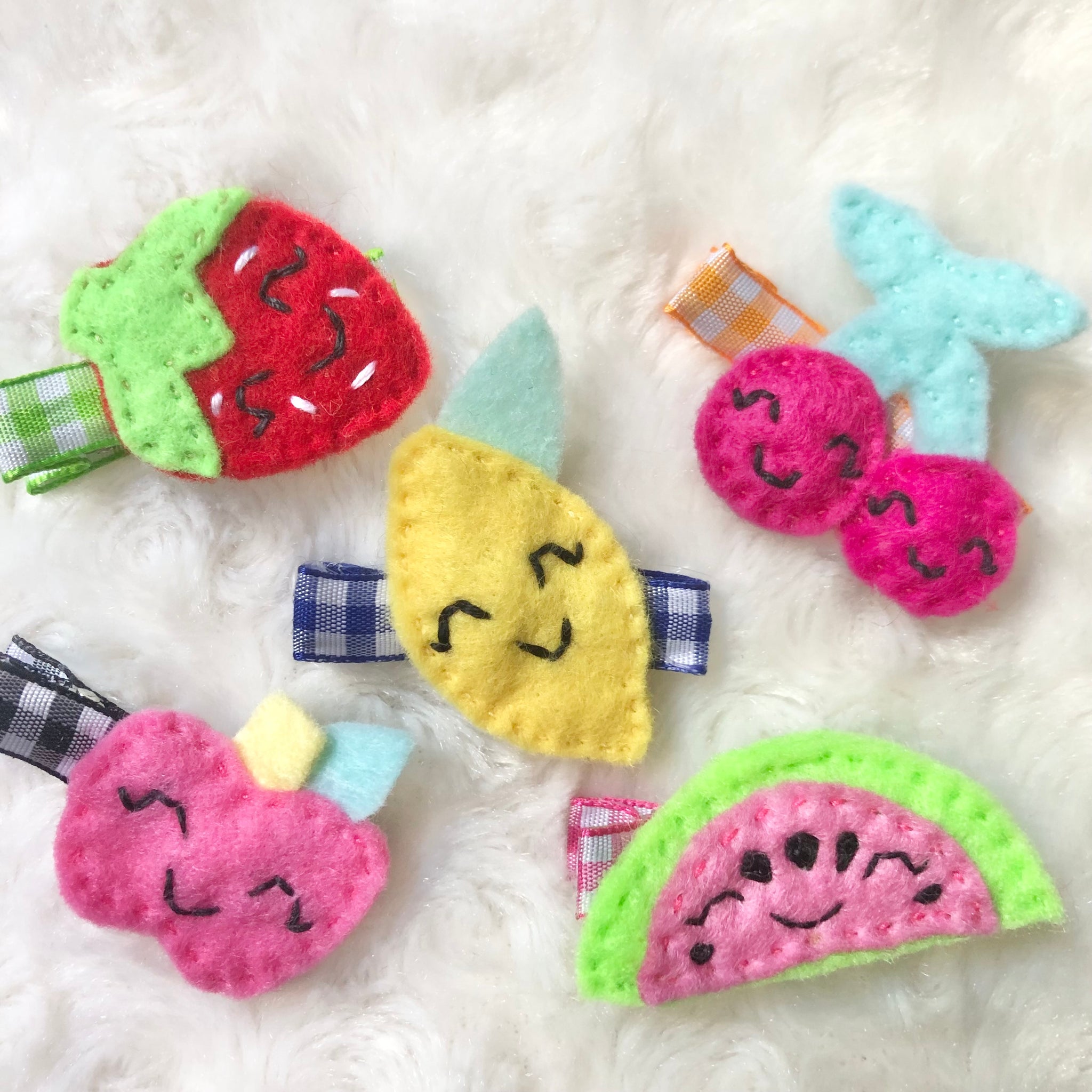 Happy fruit clips for your hair! Hand embroidery cherry on top of a coordinating ribbon lined hair clip. Clips are 2 inches long.