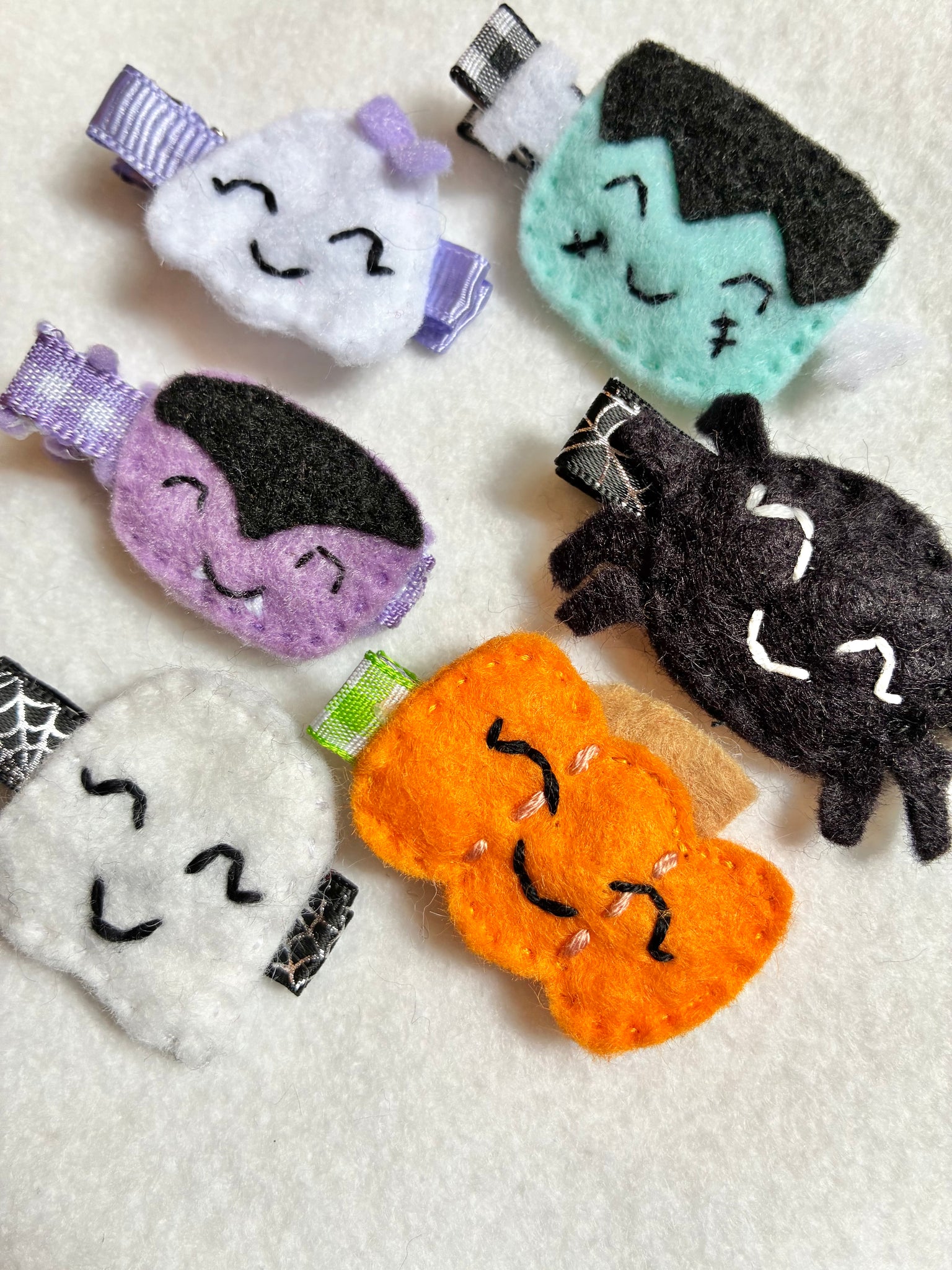 Happy spooky clips for your hair! Hand embroidered Frankenstein on top of a coordinating ribbon lined hair clip. Clips are 2 inches long.
