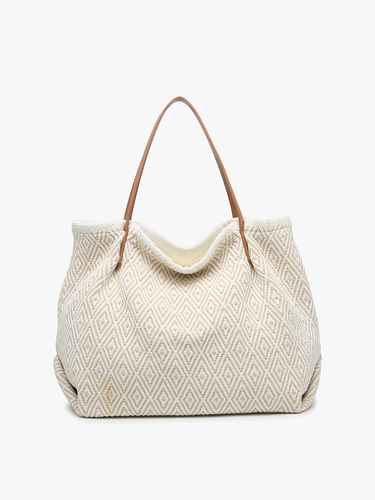 Boho Printed Cotton Tote w/ Zip Top: Beige/White