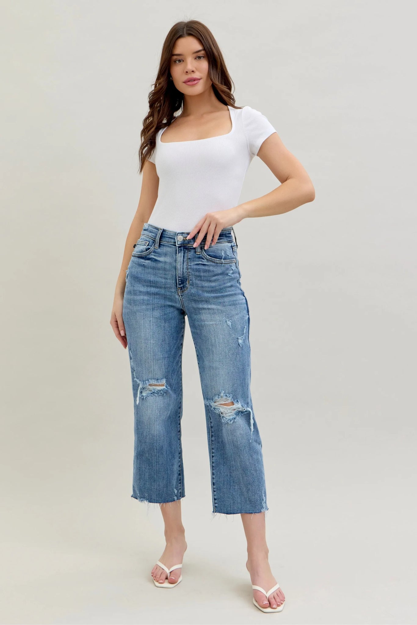 These high-waist cropped wide-leg jeans feature a distressed design for a trendy and edgy look. The high waist design offers a flattering fit and adds a modern touch to the wide-leg silhouette. The distressed detailing lends a cool and casual vibe to the jeans, perfect for creating a fashion-forward outfit. Made with high-quality denim, these jeans are both stylish and comfortable for everyday wear. Elevate your wardrobe with these chic and versatile jeans that effortlessly combine a high waist, cropped length, wide-leg silhouette, and distressed finish for a standout ensemble.