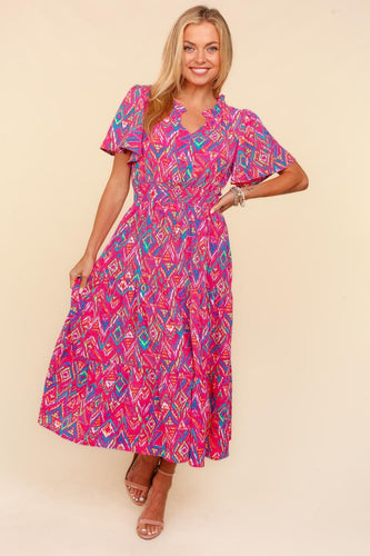 First Love Ruffled Printed Notched Cap Sleeve Dress
