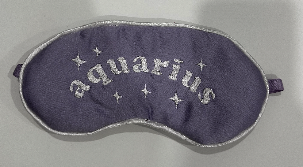 Satin sleep mask with adjustable strap for the perfect fit and extra comfort to help get the most out of your beauty sleep. Sleep masks have comfort batting interior cushioning to keep the light out and have a blackout curtain sleeping experience anywhere anytime. Features embroidered artwork saying, "Aquarius" to add some fun to your longest travel days. Perfect for long flights, bright hotel rooms, and more. This sleep mask was designed and handmade by 9th Ave Designs.