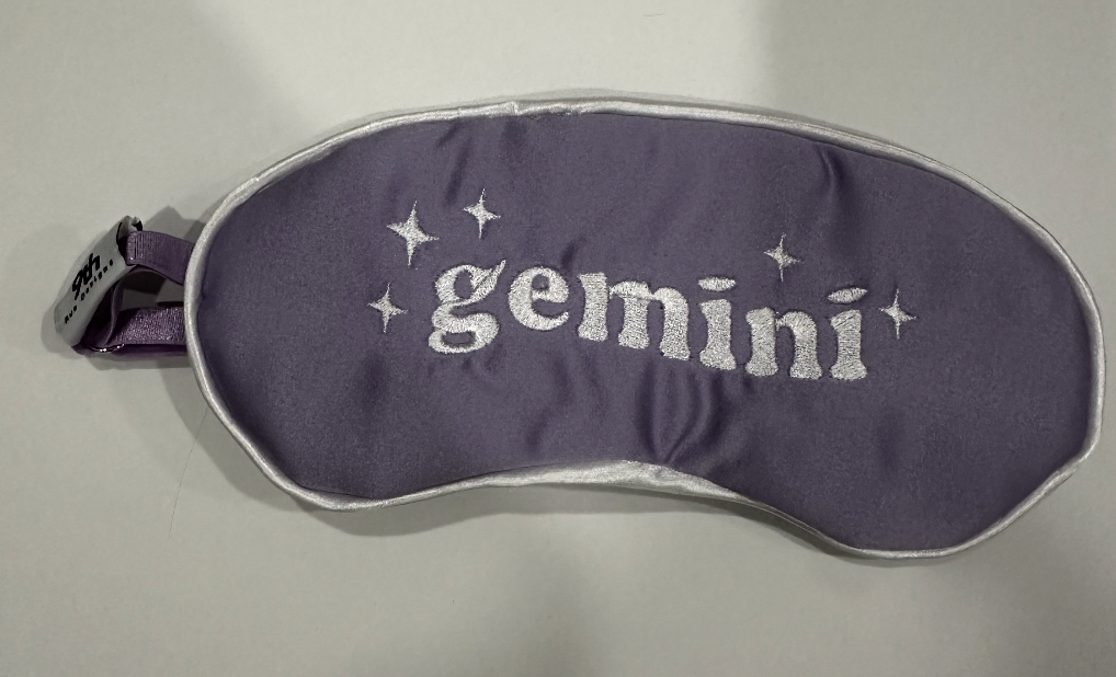 Satin sleep mask with adjustable strap for the perfect fit and extra comfort to help get the most out of your beauty sleep. Sleep masks have comfort batting interior cushioning to keep the light out and have a blackout curtain sleeping experience anywhere anytime. Features embroidered artwork saying, "Gemini" to add some fun to your longest travel days. Perfect for long flights, bright hotel rooms, and more. This sleep mask was designed and handmade by 9th Ave Designs.