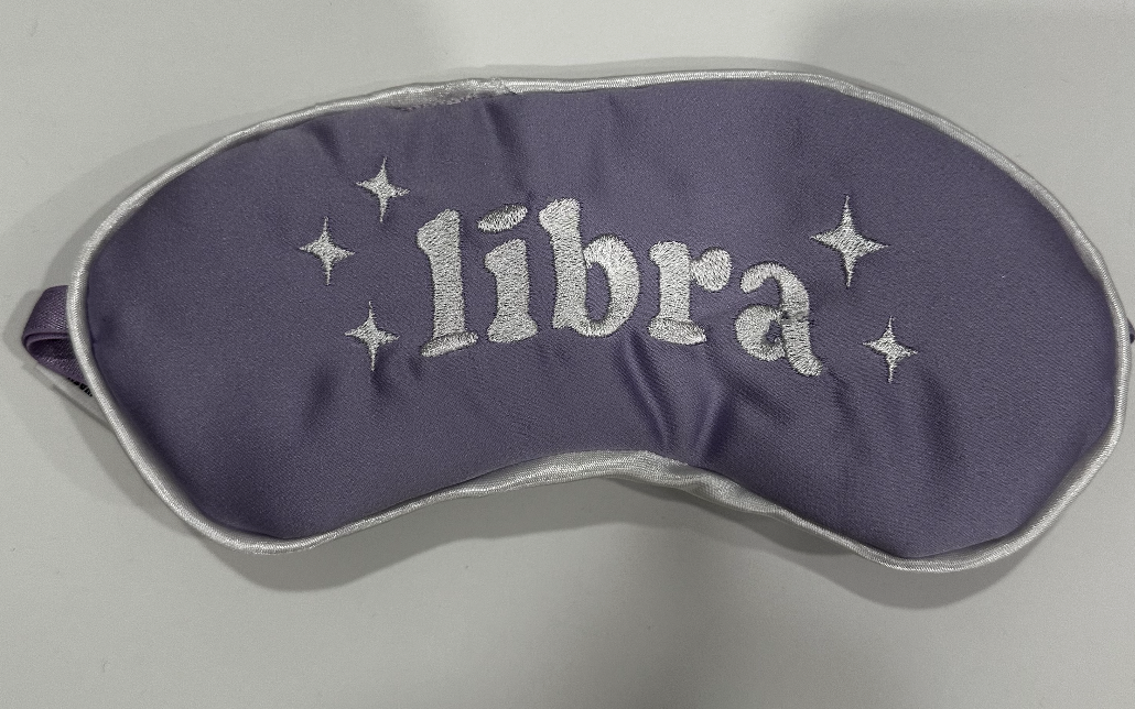 Satin sleep mask with adjustable strap for the perfect fit and extra comfort to help get the most out of your beauty sleep. Sleep masks have comfort batting interior cushioning to keep the light out and have a blackout curtain sleeping experience anywhere anytime. Features embroidered artwork saying, "Libra" to add some fun to your longest travel days. Perfect for long flights, bright hotel rooms, and more. This sleep mask was designed and handmade by 9th Ave Designs.